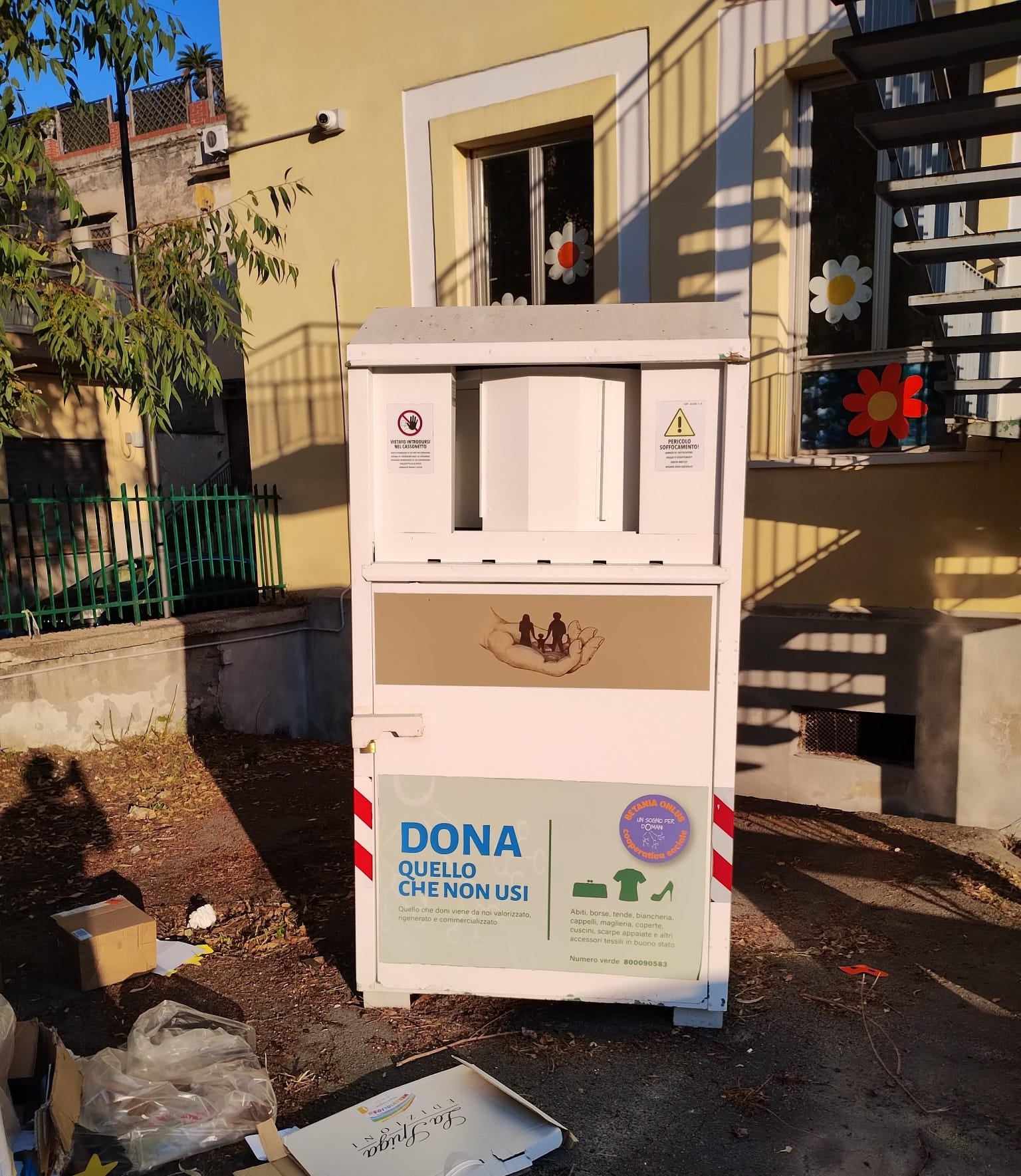 Altri due raccoglitori sono stati installati anche all’uscita dei locali commerciali Supermercato Due Esse– via Europa – e Max Hebron -via Don Minzoni – . Dalle nostre foto, come emerge anche da quella scattata alla Scuola De Luca Picione, risultano affissi su di essi in forma pubblicitaria i loghi della Cooperativa Sociale Betania Onlus che annuncio il messaggio testuale: dona quello che non usi, quelle che non usi viene da noi rigenerato e commercializzato e sono questi articoli tessili: abiti, borse, tende, biancheria, cappelli, maglieria, coperte, cuscini, scarpe appaiate ed altro accessori tessili in buono stato. Le domande sorgono spontanee: perchè la Eco Office, azienda aggiudicatrice dell’appalto per la raccolta dei rifiuti solidi urbani, dovrebbe cedere un’opportunità di guadagno e perchè proprio alla Betania Onlus sorvolando eventuali manifestazioni d’interesse del comune di Cercola in grado di garantire una pari opportunità di accesso al servizio per tutte le realtà del settore? Chi avrebbe autorizzato l’insediamento di questi cassonetti quando tale servizio è contenuto al punto del 13 del capitolato d’appalto del servizio della raccolta dei rifiuti solidi urbani del comune di Cercola?