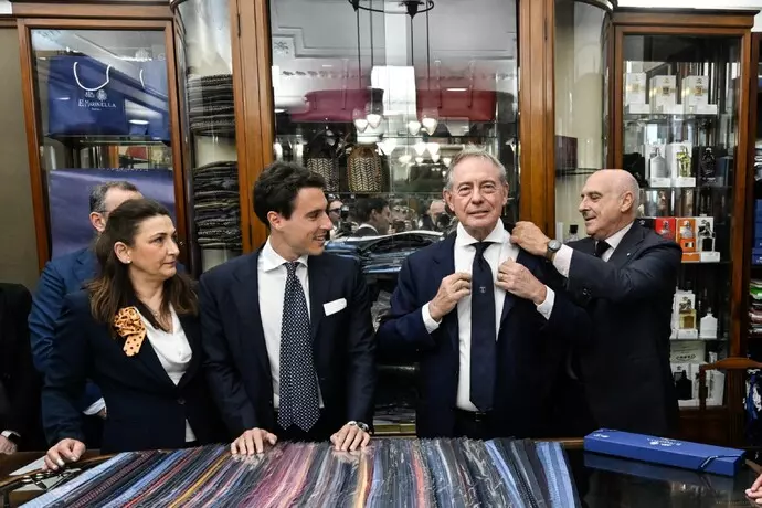Il ministro delle Imprese e del Made in Italy, Adolfo Urso, ha visitato, nell’ambito delle celebrazioni della Giornata Nazionale del Made in Italy 2025, lo storico negozio Marinella di Napoli, dove è stata presentata la cravatta dedicata alla Giornata Nazionale del Made in Italy raffigurante l’uomo vitruviano, il celeberrimo disegno di Leonardo da Vinci di cui oggi ricorre l’ anniversario della nascita. “Marinella è uno dei simboli italiani del saper fare, che da sempre si basa sull’identità, sulle sue peculiarità e specificità, sull’espressione di un territorio – ha detto Urso -.