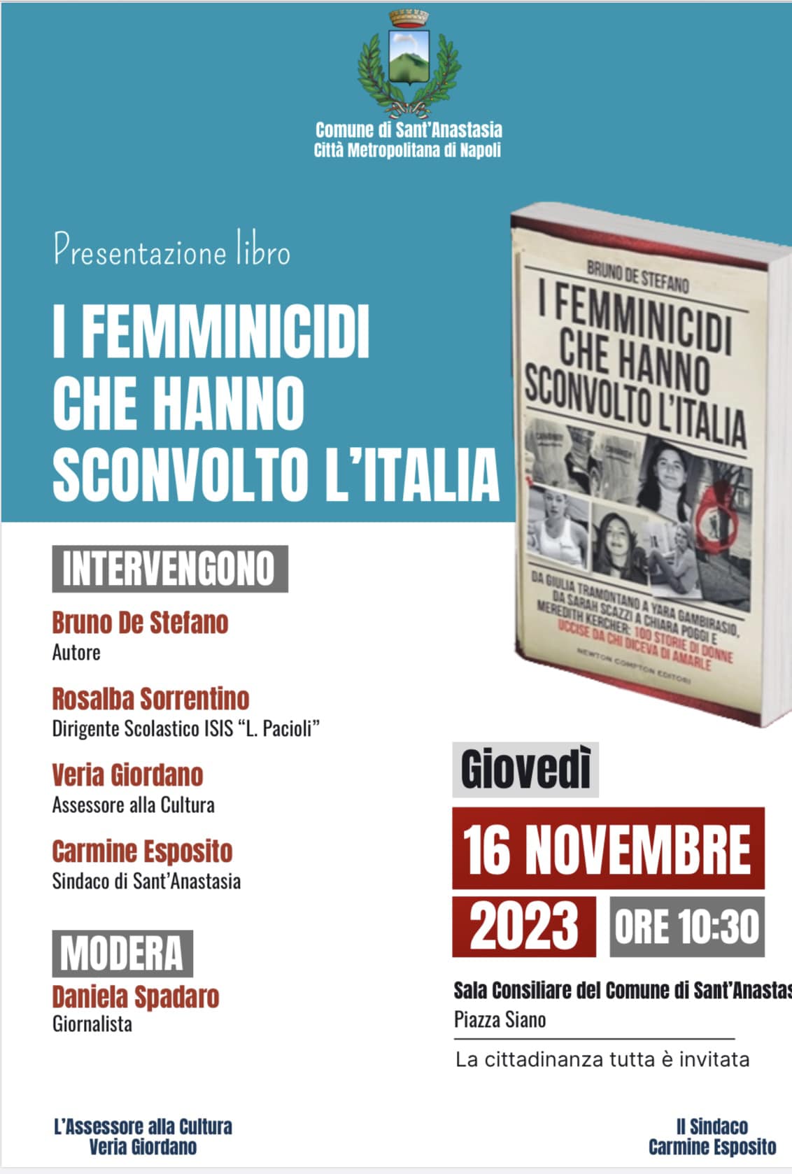 Sarà presente una rappresentanza degli studenti dell’IIS Luca Pacioli – S. Anastasia e interverranno l’autore, la dirigente scolastica Rosalba Sorrentino, l’Assessore Veria Giordano (Cultura, Pubblica Istruzione), il Sindaco Carmine Esposito.