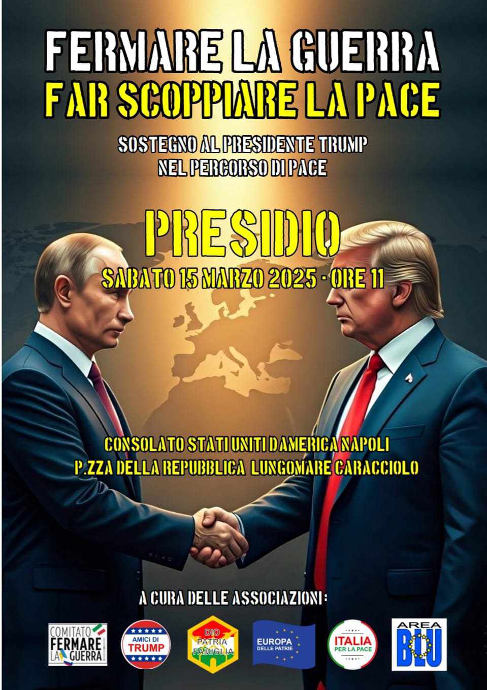 Napoli – “Sabato 15 marzo, ore 11, davanti al Consolato degli Stati Uniti d’America sul lungomare di Napoli, si terrà il presidio organizzato da diverse associazioni, di solidarietà e sostegno al presidente Trump nel difficile percorso intrapreso per giungere alla conclusione del conflitto Russo-Ucraino.” Lo annuncia Pietro Diodato, già consigliere regionale della Campania e presidente di Area Blu, una delle associazioni promotrici dell’evento.
