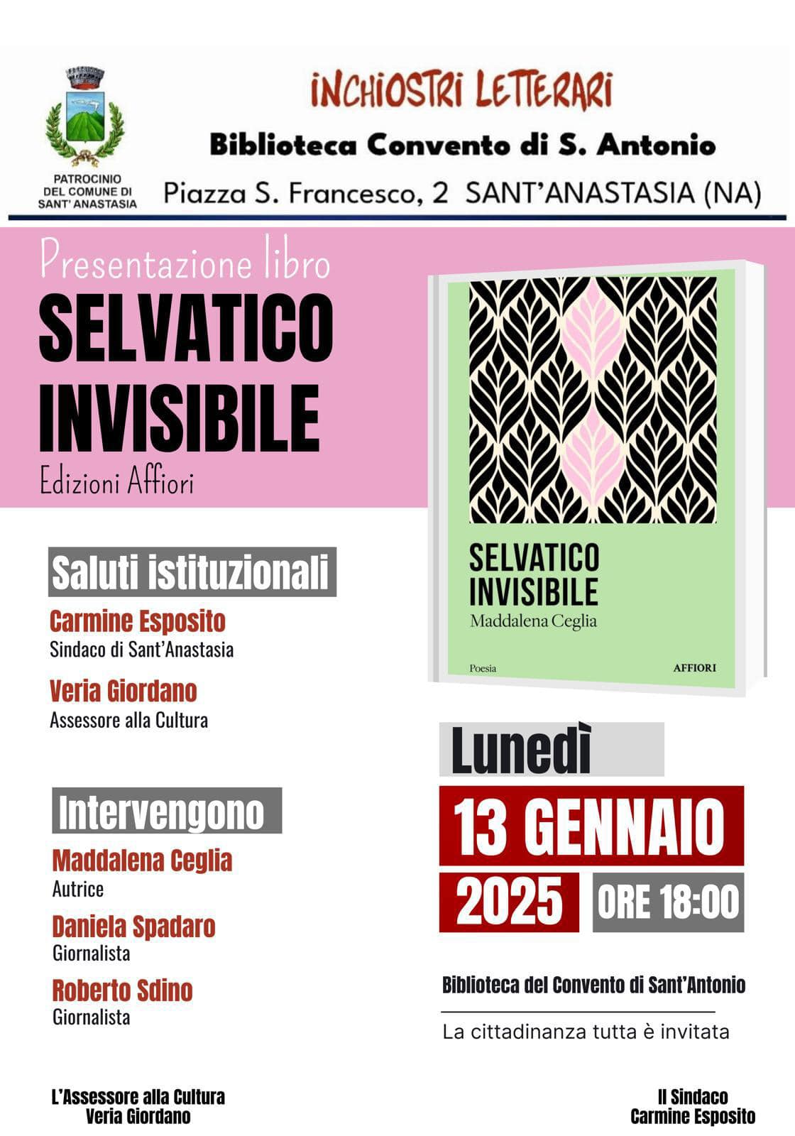 Sant’Anastasia (Na) – Alle 18:00 di lunedì 13 gennaio – nella biblioteca “Guido Giustiniani” del Convento di Sant’Antonio, nell’ambito della rassegna “InChiostri Letterari”, sarà presentato il libro “Selvatico Invisibile” la prima raccolta di poesie di Lena Ceglia edito da Affiori.