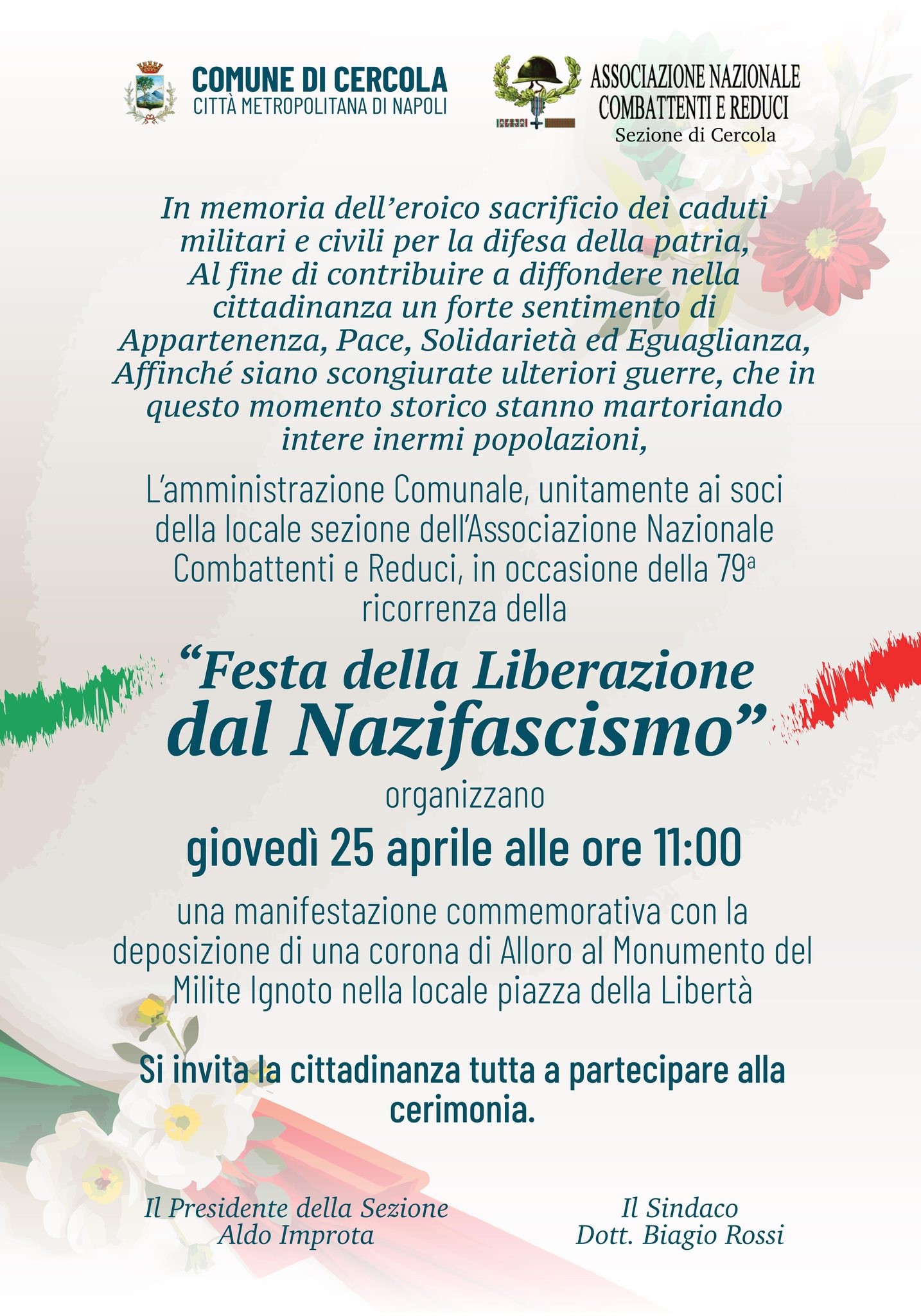 Cercola (Na) – La Festa delle Forze Armate del 4 novembre 2023 non fu celebrata dall’amministrazione comunale guidata dal sindaco Biagio Rossi, ma oggi, in pompa magna, però, si annuncia l’iniziativa della “Festa della Liberazione dal Nazifascismo” del 25 aprile: il sindaco Biagio Rossi ed Aldo Improta, presidente del circolo ( ormai divenuto circoletto ) dei Combattenti e Reduci hanno confezionato un manifesto politico fatto affiggere sui tabelloni istituzionali lungo le strade cittadine e pubblicati sui social, tanto di patrocino morale del comune di Cercola. Il chiaro intento politico, alimentato da “quelli del circoletto”, sarebbe questo: strumentalizzare, a fini politici, anche questa celebrazione,di proprietà della sinistra italiana, al fine di lanciare un segnale di ‘esistenza in vita’ ai delusi gruppi di sinistra che hanno sostenuto la proposta del cambiamento in città incarnata da Rossi in campagna elettorale, al momento chiusa a 23 mandate nel cassetto degli uffici al Municipio.