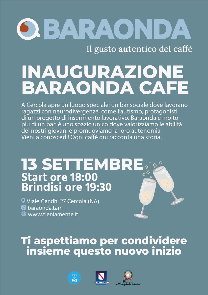 Cercola (Na) – Manca ormai poco all’apertura ufficiale di Baraonda Cafe, un bar sociale gestito da ragazzi affetti da spettro autistico e supportato da TAM Cooperativa Sociale. I ragazzi saranno seguiti dagli educatori della cooperativa nello svolgimento delle loro mansioni, infatti, il progetto nasce con l’intento di creare un ambiente in cui il lavoro rappresenti non solo un’opportunità di inclusione ma anche di crescita professionale e personale, fornendo l’occasione di valorizzare le abilità e l’indipendenza dei giovani partecipanti.