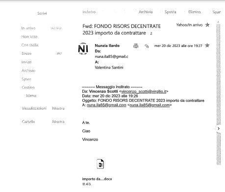 LA CONTROVERSA MAIL SCOTTI/ILARDO CONTERREBBE PROPOSTA DI SCOTTI SUL FONDO PERSONALE, SI IPOTIZEREBBE DAL DOSSIER SANTINI. Il segretario generale Valentina Santini ricevette alle ore 19,27 del 27 dicembre 2023 sulla sua casella di posta ordinaria santini.valentina@yahoo.it un inoltro di messaggio di posta elettronica da parte della casella sempre di posta ordinaria nuna.ila85@gmail.com, intestata ad Annunziata Ilardo, assessore alla legalità e personale in carica, come si deduce dal curriculum dei candidati al consiglio comunale presentato al municipio in occasione della competizione elettorale comunale e pubblicato nella sezione elezioni trasparenti del sito ufficiale del comune di Cercola, infatti, Annunziata Ilardo fu candidata non eletta per la lista Liberi e Forti. Da questo inoltro di messaggio si aggancia il messaggio – datato 20 dicembre 2023 – che inviò Vincenzo Scotti dalla casella Vincenzo_Scotti@virgilio.it , utenza che sarebbe in uso dallo Scotti da una ventina di anni, alla stessa Ilardo contenente un allegato word utilizzato per un sorta di conteggi per il calcolo del fondo decentrato da destinare al personale del comune di Cercola. Come sosterrà, sempre nel suo Dossier Valentina Santini, tali conteggi potrebbero essere stati utilizzati per la proposta della giunta municipale relativamente al provvedimento da adottare.