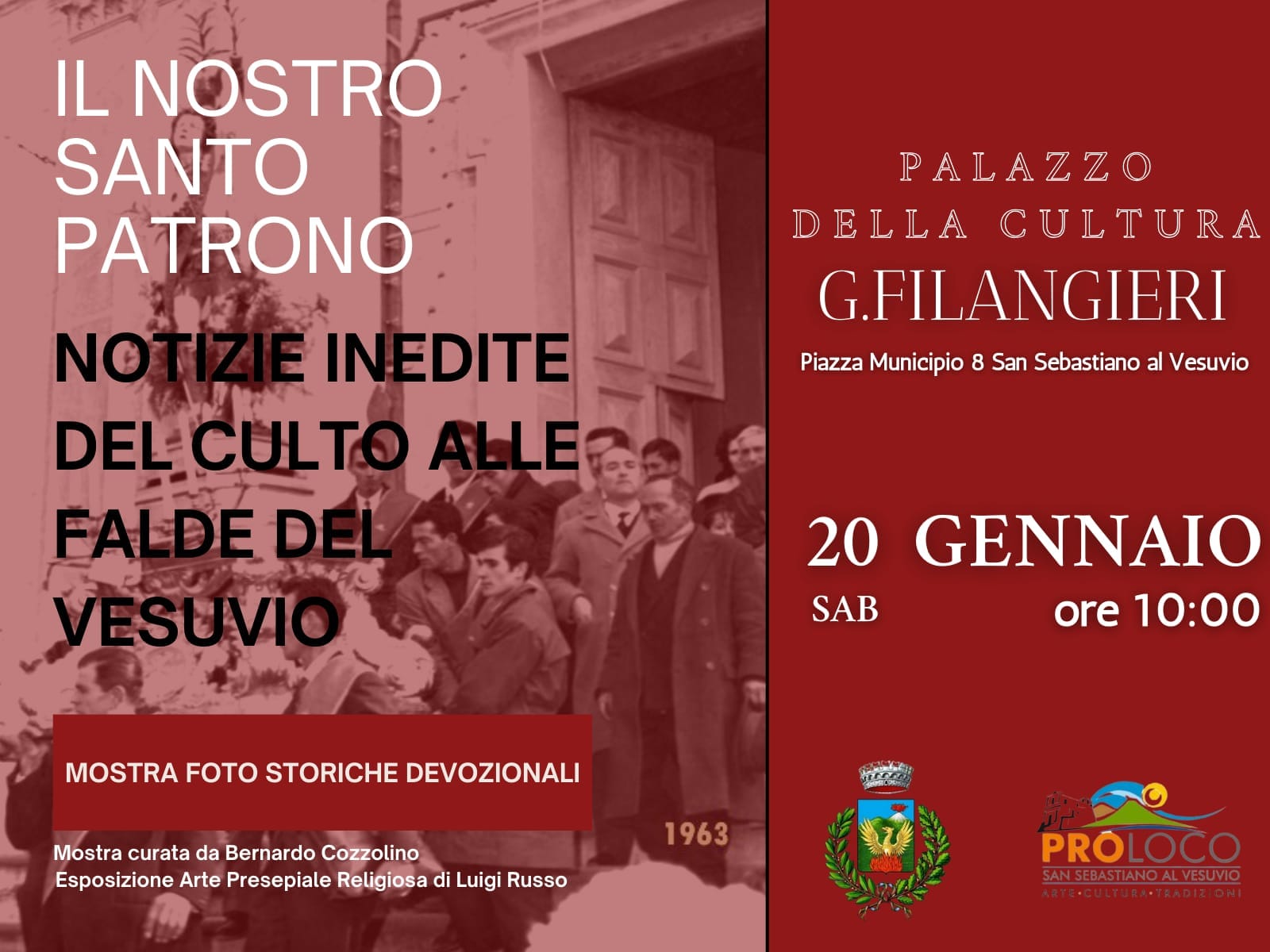 In occasione dell’inaugurazione di Sabato 20 gennaio 2024 alle ore 10.00 presso “ La Casa della Cultura Cavalier Gaetano Filangieri”, il dottor Bernardo Cozzolino presenterà i’opuscolo intitolato“ al Cavalier Gaetano Filangieri.”. Le inedite notizie storiche emerse circa l’antico culto del nostro Santo Patrono si legheranno alla delucidazione della mostra fotografica delle processioni passate. Nell’occasione sarà proiettata l’esposizione di foto digitali delle processioni più recenti e curata dall’architetto Gino Scarpato a cui sarà affiancata l’esposizione di arte sacra dell’artigianato Luigi Russo.